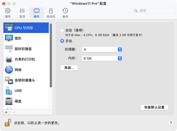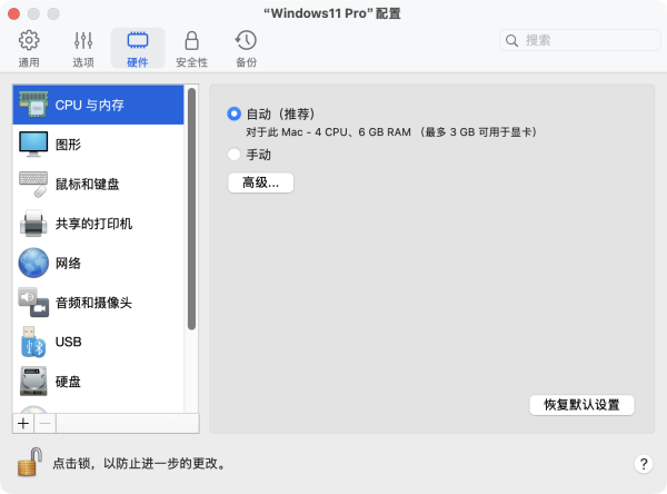 3.切换到 硬件 -> CPU 与内存 ,默认是 自动 。