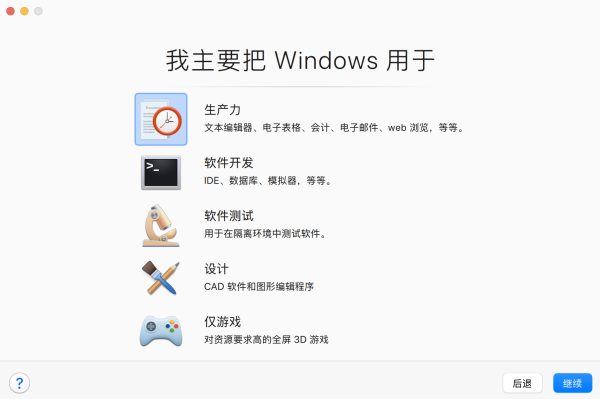 7.指定 Windows 虚拟机应用场景 ,默认是 生产力 ,点击 继续 。