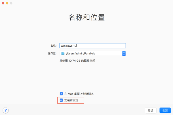 8.指定Windows 虚拟机名称,安装路径,并勾选 安装前设定 ,点击 创建 。