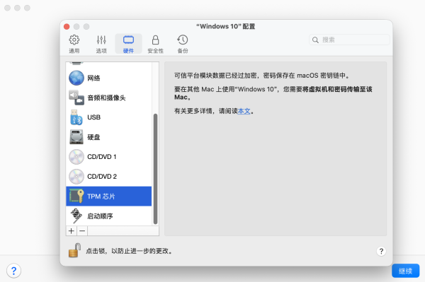 9.在 Windows 虚拟机配置页面,切换到 硬件 ,选中 TPM芯片 ,点击 “-”,删除该硬件,并关闭虚拟机配置页面。